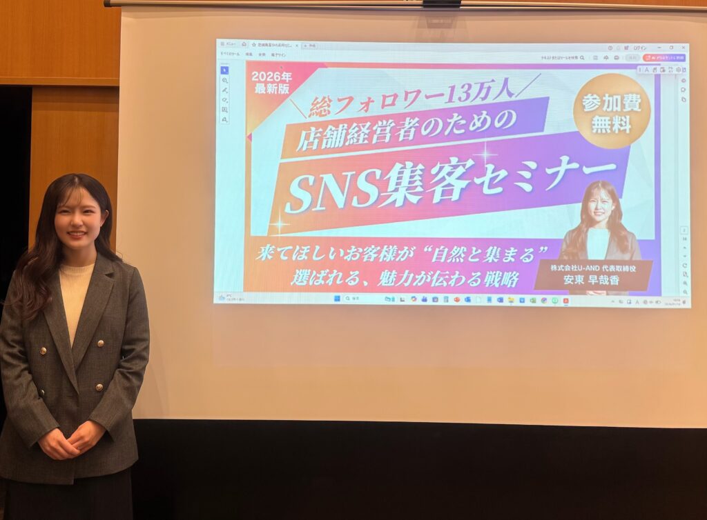 2026年1月14日、福岡・天神のエルガーラホールにて「店舗経営者のためのSNS集客セミナー(第12回「解決市場」)」に弊社代表の安東が登壇いたしました。 2026 4/02 プレスリリース 2026年4月2日 2026年1月14日、福岡・天神のエルガーラホールにて「店舗経営者のためのSNS集客セミナー(第12回「解決市場」)」に弊社代表の安東が登壇いたしました。 あわせて読みたい 解決市場ビジネスインサイト プレスリリース よかったらシェアしてね! URLをコピーしました! URLをコピーしました! ラジオ番組『デンヒチpresents 堀江貴文Special Program ホリスペ!』に出演いたしました。 2026年2月1日発売「ふくおか経済 vol.450」に弊社の取り組みについて掲載されました。 この記事を書いた人 u-and 関連記事 2026年3月商工会議所広報誌に弊社の取り組みについて掲載されました。 2026年4月2日 「女性社長.net」に弊社代表の安東が掲載されました。 2026年4月2日 2026年2月1日発売「ふくおか経済 vol.450」に弊社の取り組みについて掲載されました。 2026年4月2日 ラジオ番組『デンヒチpresents 堀江貴文Special Program ホリスペ!』に出演いたしました。 2026年4月2日 公式ホームページ開設のお知らせ 2026年1月11日 コメント コメントする コメントをキャンセルコメント ※ 名前 ※ メール ※ サイト 次回のコメントで使用するためブラウザーに自分の名前、メールアドレス、サイトを保存する。 上に表示された文字を入力してください。
